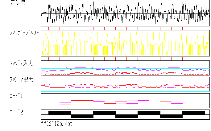 ファジィ推論における受信信号とそのフィンガープリント、ファジィ推論への入力、ファジィ推論結果及びコードを図2に示す。これらは処理プログラムのデモンストレーション画面のハードコピーである。FPKの受信信号の復調結果を表1に示す。これはシミュレーション実験として実際に空気中を伝送させた信号のフィンガープリントを計算し、それを認識させた結果である。ニューラルネットワークによる認識結果を併せて示す。結果を見るとニューラルネットワークを用いた認識では再学習による認識率の向上が見られる。しかしファジィ推論を用いた認識方法の方が認識率は優れている。この処理の例では信号の違いはフィンガープリントの形状の定量的な差として反映される。従ってこの定量的な差を認識すればよいことになり、フィンガープリントからファジィ推論への特徴量の受渡しが容易でありファジィ推論での高い認識率が得られた。しかし、信号の位相差を認識するような場合、その差はフィンガープリントのパターンそのもの(位相幾何的情報)の違いとして現れることになり、ファジィ推論への特徴量として表現することはむずかしくなる。